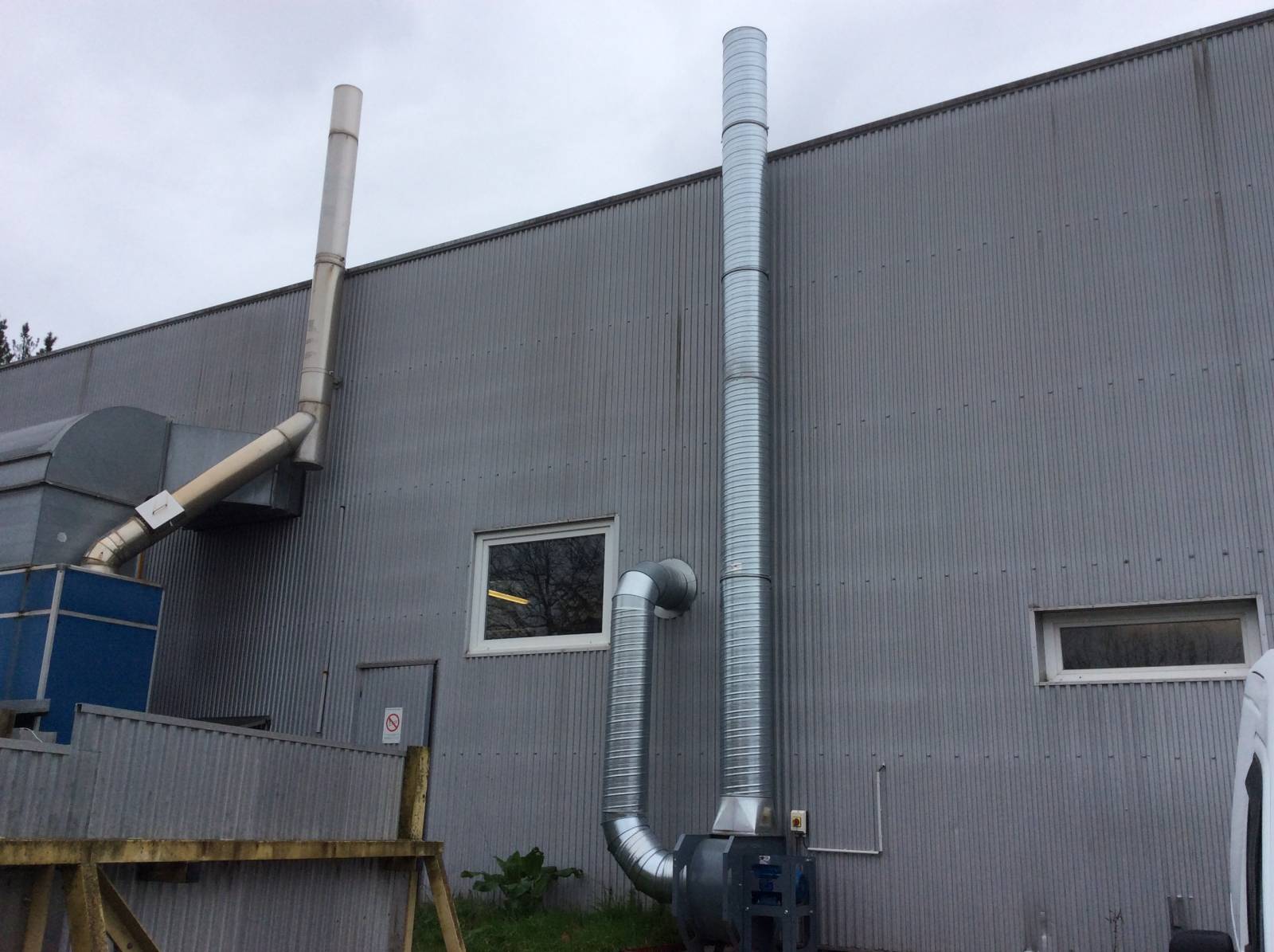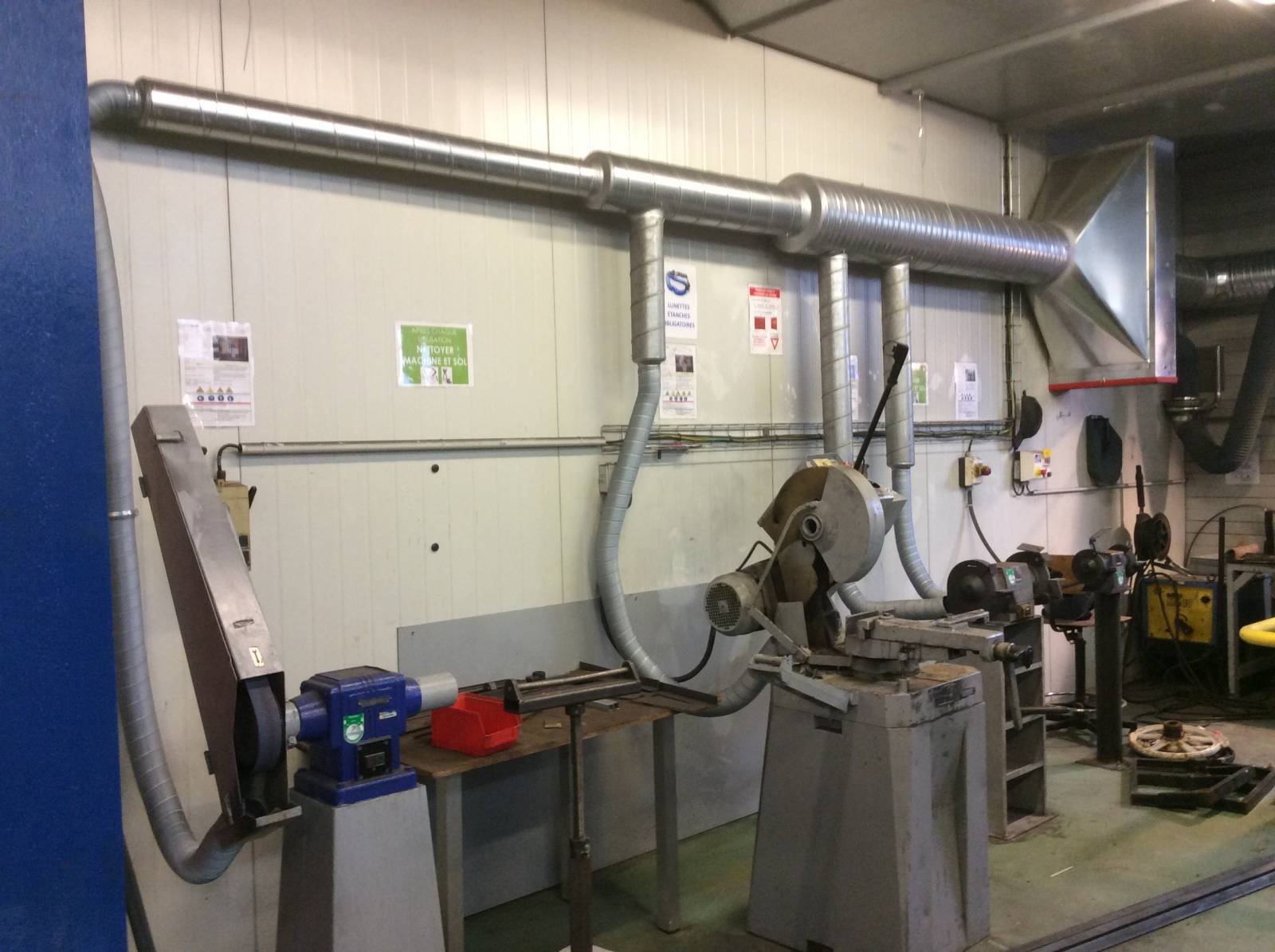 Pour les bacs d'acide : Un extracteur en PVC, des gaines et des capots de captation en inox. Pour les tourets de meuleuses : Un extracteur en acier peint, des gaines galvanisées et un caisson filtre galva avec filtre métallique et filtre finisseur.