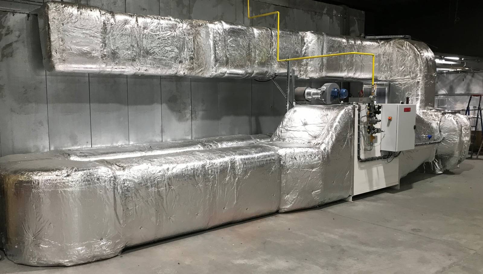Il a été installé, un brûleur gaz modulant, un ventilateur de brassage avec un débit approprié au volume de l'étuve, un réseau de gaines de soufflage avec grilles de répartition d'air ainsi qu'un réseau de reprise avec grilles d'aspiration réparties sur toute la longueur.
